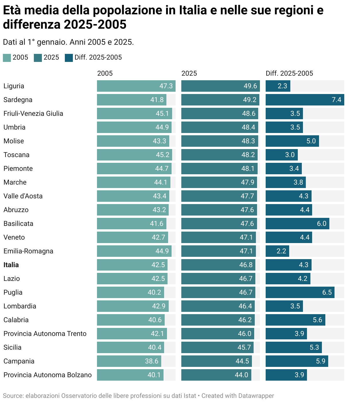 Le regioni in cui si osservano i maggiori incrementi sono tendenzialmente quelle del Mezzogiorno. Nello specifico, il valore massimo si registra in Sardegna (+7,4 anni), seguita da Puglia (+6,5), Basilicata (+6,0) e Campania (+5,9). Sebbene gli aumenti più significativi dell’età media si osservino nelle regioni meridionali, i livelli di partenza più bassi fanno sì che, al 2025, siano altre le regioni a presentare i valori più elevati — con l’eccezione della Sardegna. Il primato spetta alla Liguria, dove l’età media raggiunge i 49,6 anni; solo in questa regione e in Sardegna si supera la soglia dei 49 anni. Valori superiori ai 48 anni si registrano anche in Friuli-Venezia Giulia, Umbria, Molise, Toscana e Piemonte.