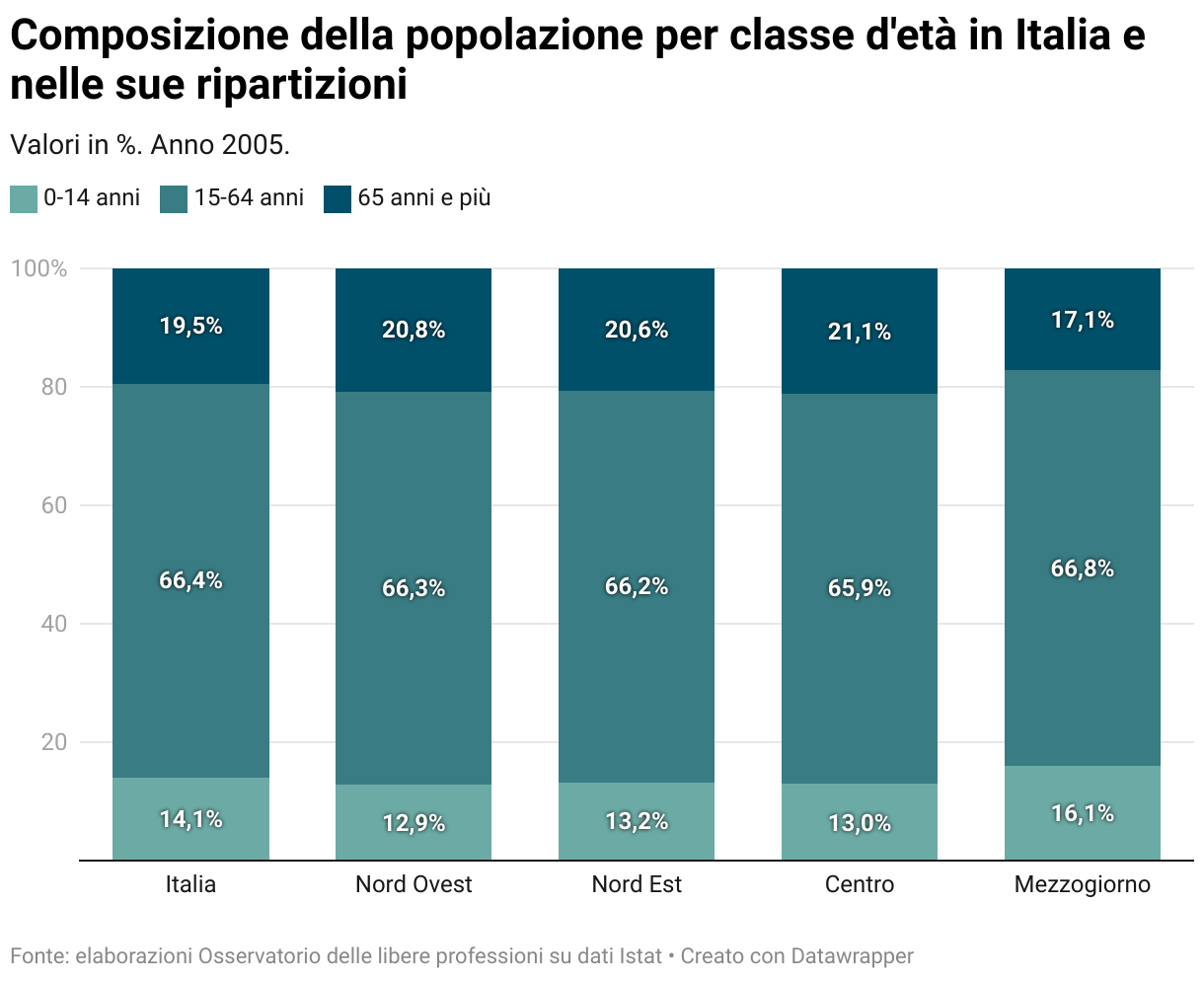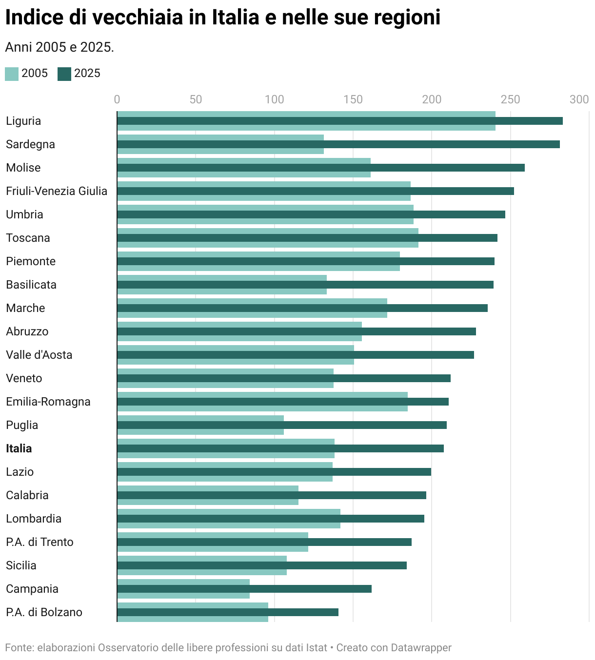 Al 2025 l’indice di vecchiaia in Italia è pari a circa 208, vale a dire che gli anziani sono più del doppio dei giovani. In Liguria e in Sardegna i valori dell’indicatore risultano particolarmente critici, sfiorando quota 300: ciò significa che per ogni giovane ci sono quasi tre anziani. Nel 2005 vi erano ancora regioni in cui l’indice di vecchiaia risultava inferiore a 100; secondo gli ultimi dati, invece, in nessuna regione italiana il valore scende oggi sotto quota 140.